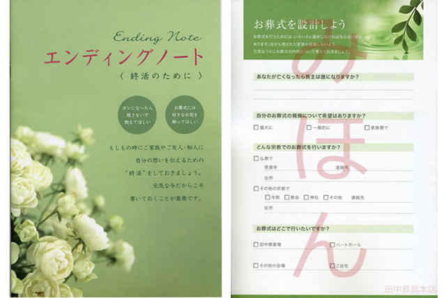 田中葬具本店のご紹介から、葬儀の流れや事前準備を網羅した総合パンフレットです。