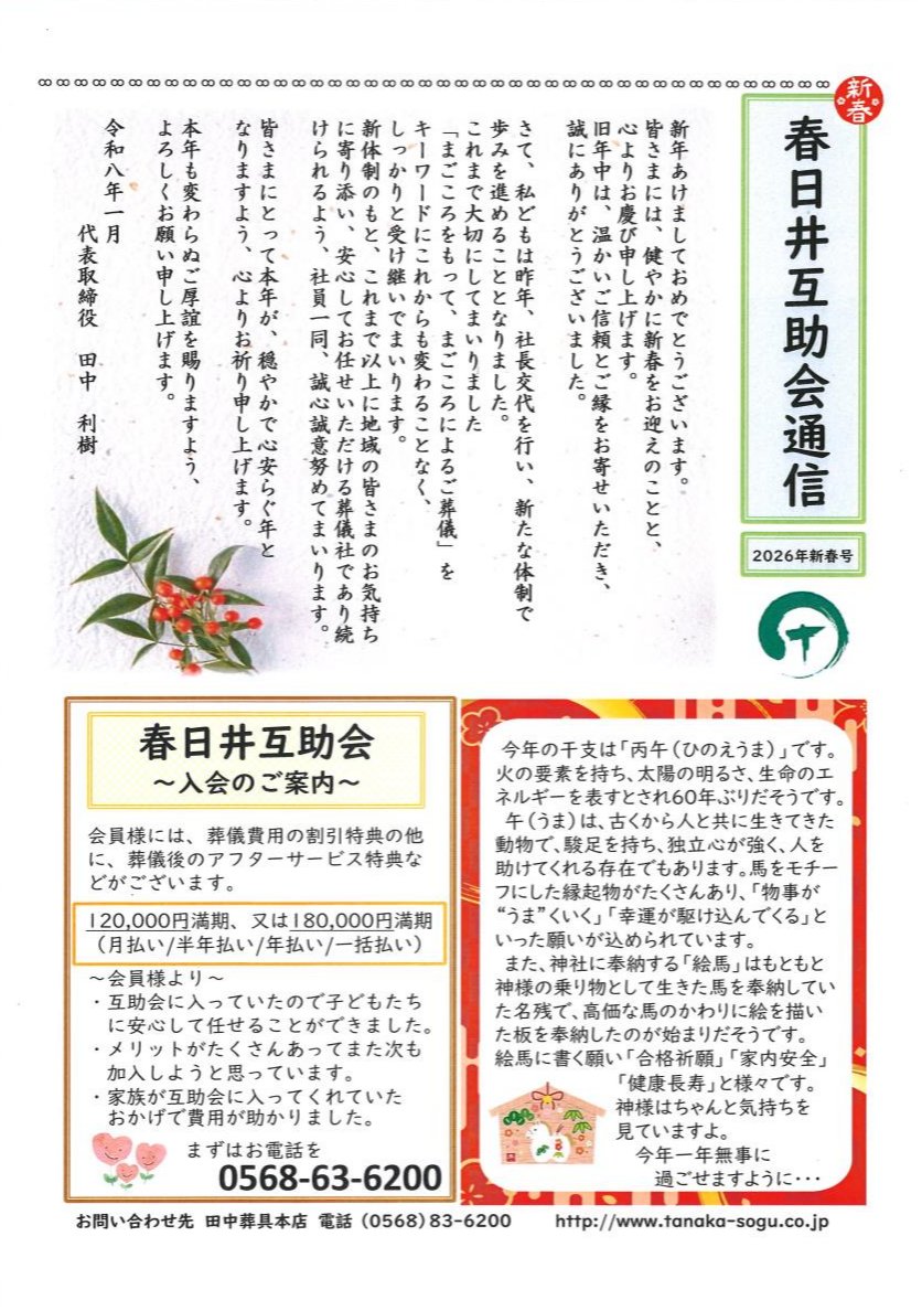 さて、このたび「春日井互助会通信 2026年新春号」を発行いたしました。