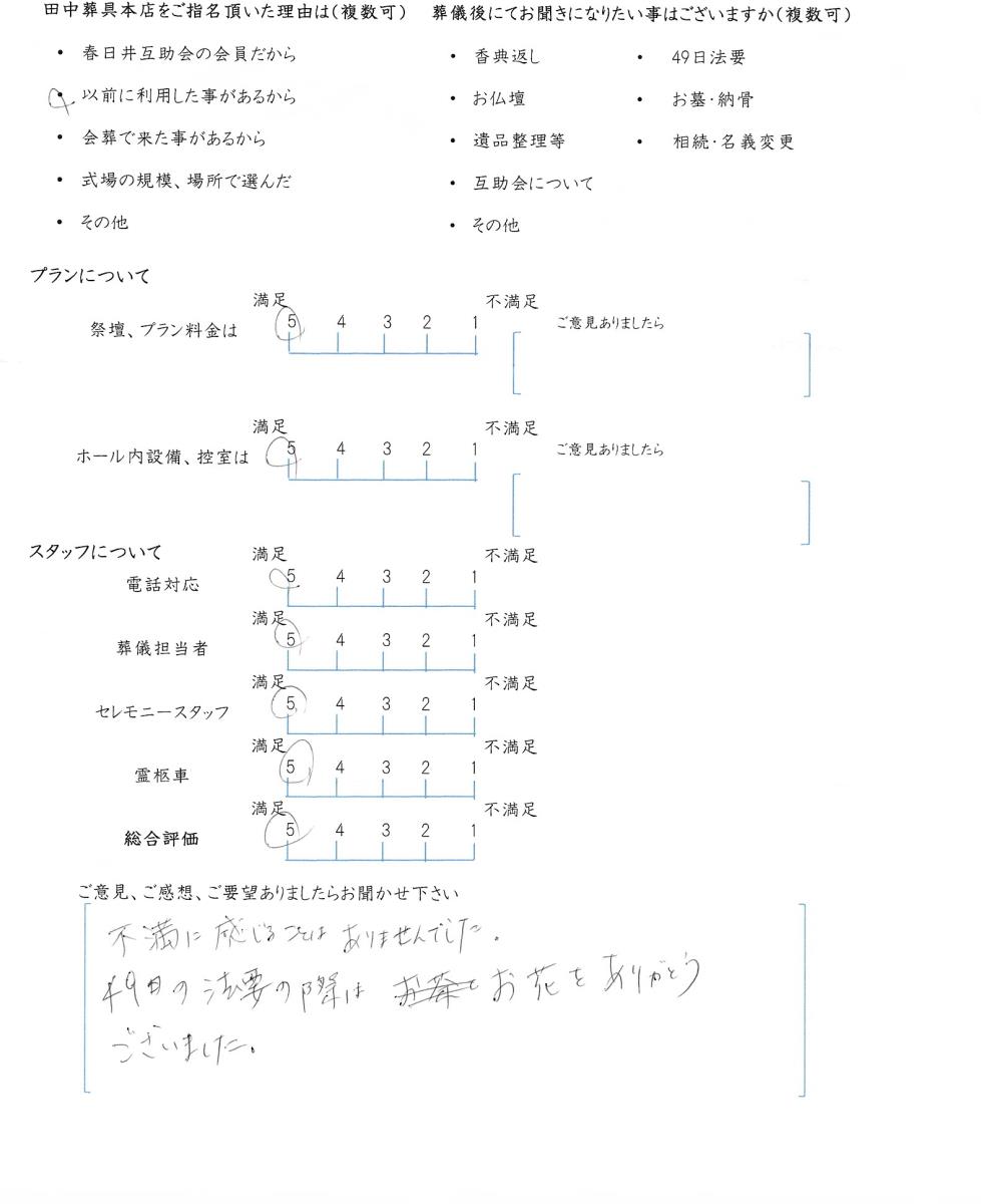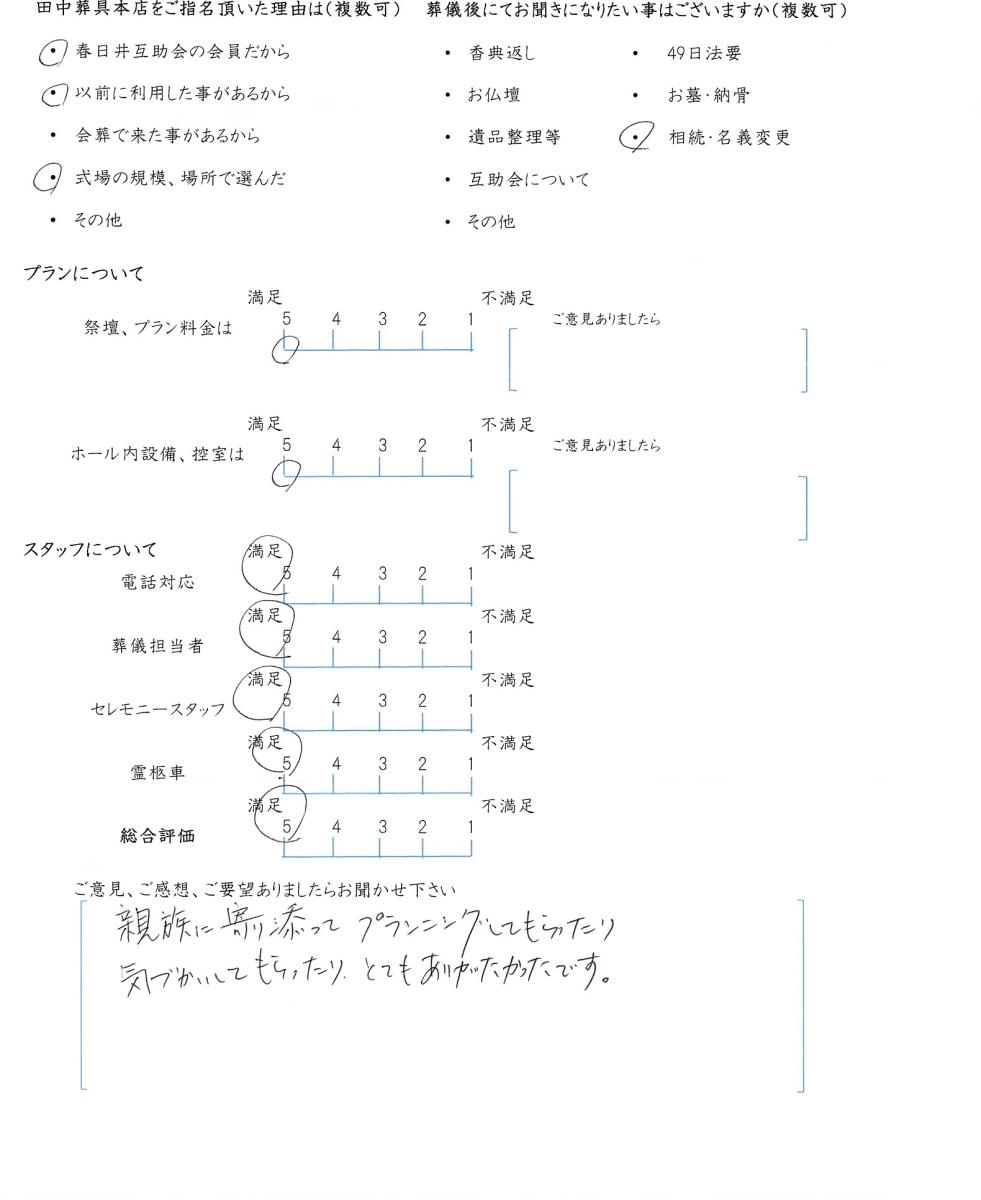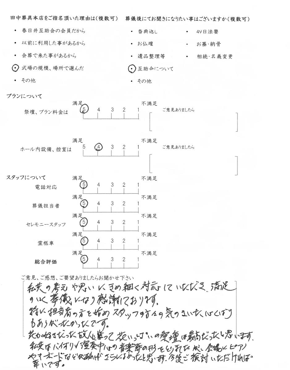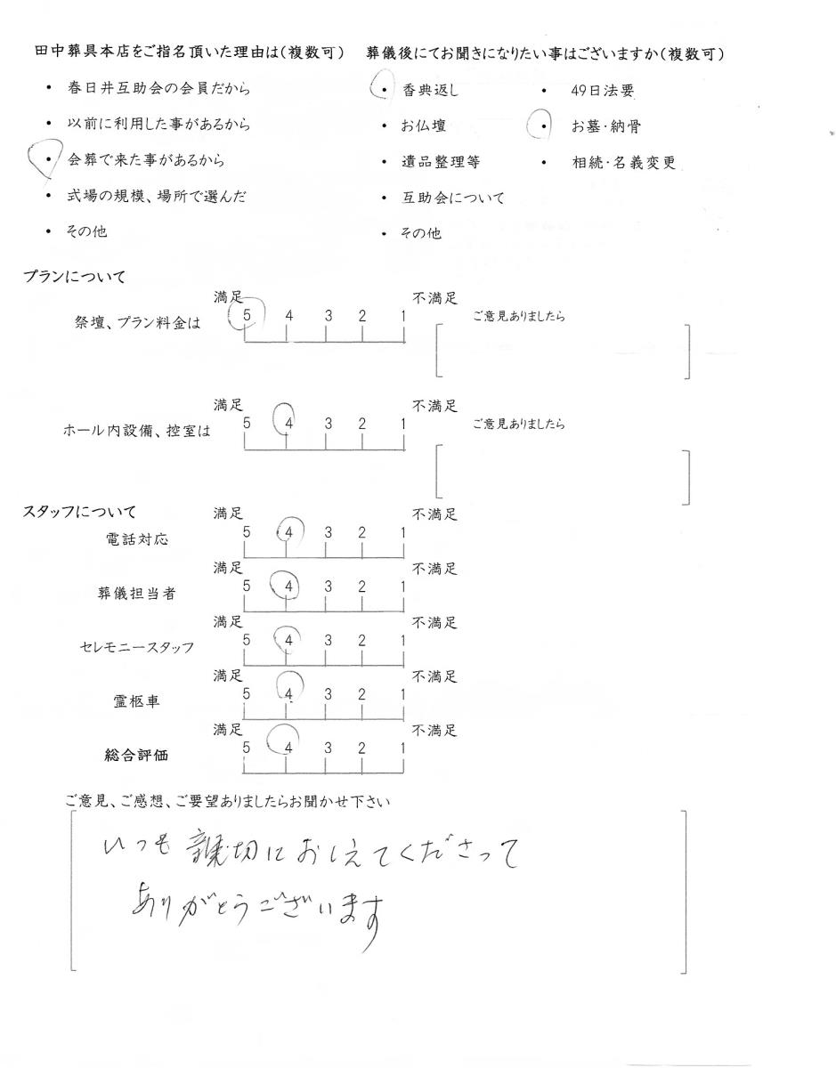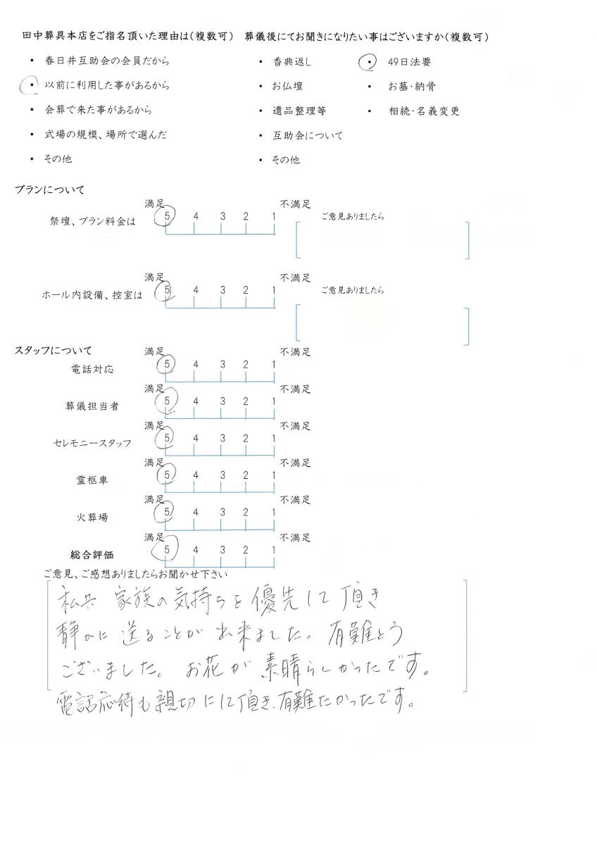 今後もいただきましたご意見を参考に、ご遺族様に寄り添ったお葬式のお手伝いをさせて頂きたいと思います。この度はありがとうございました。