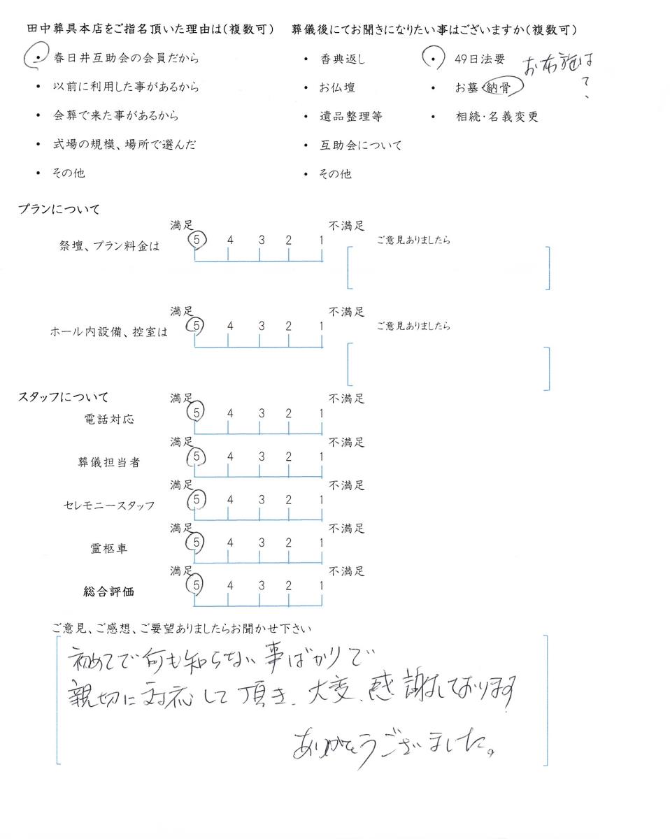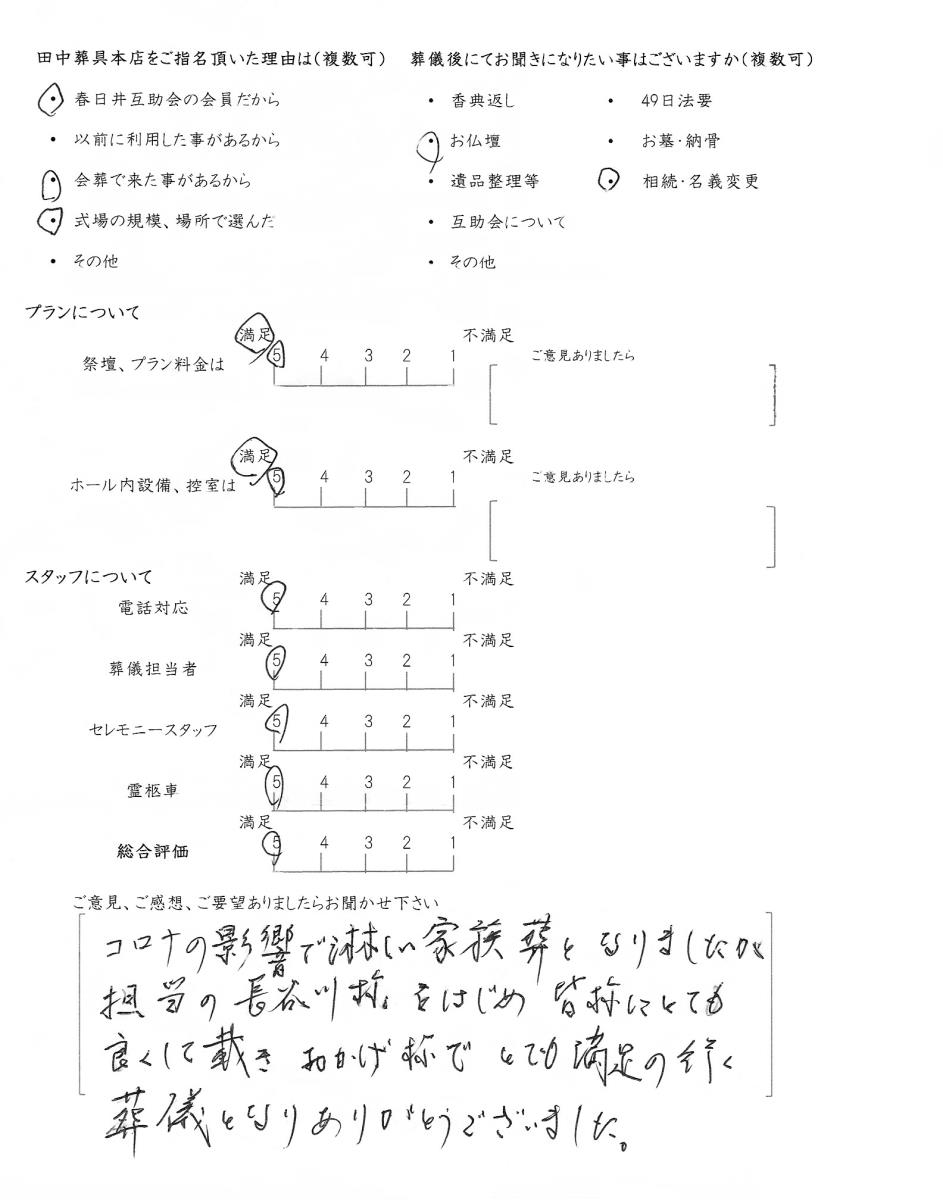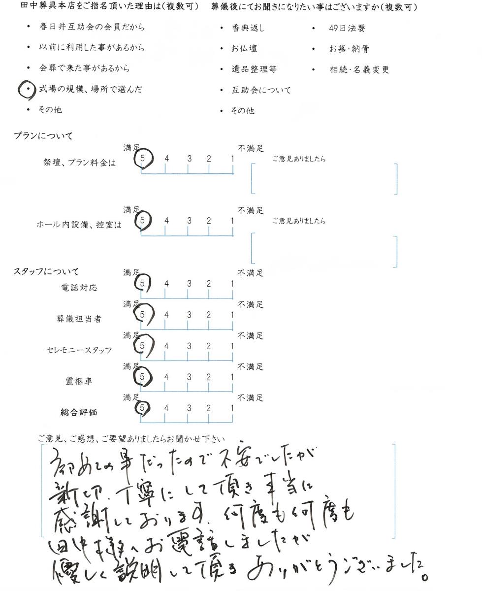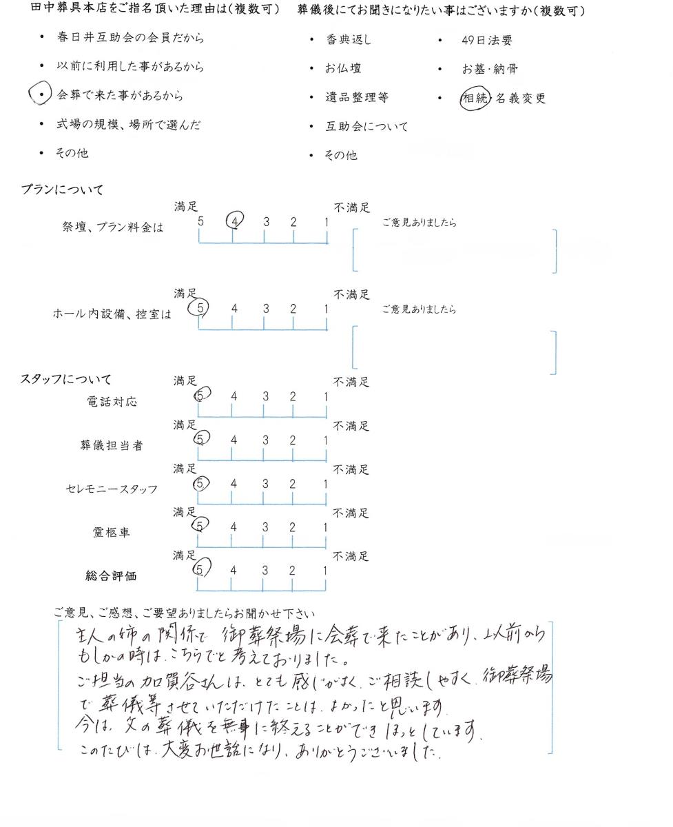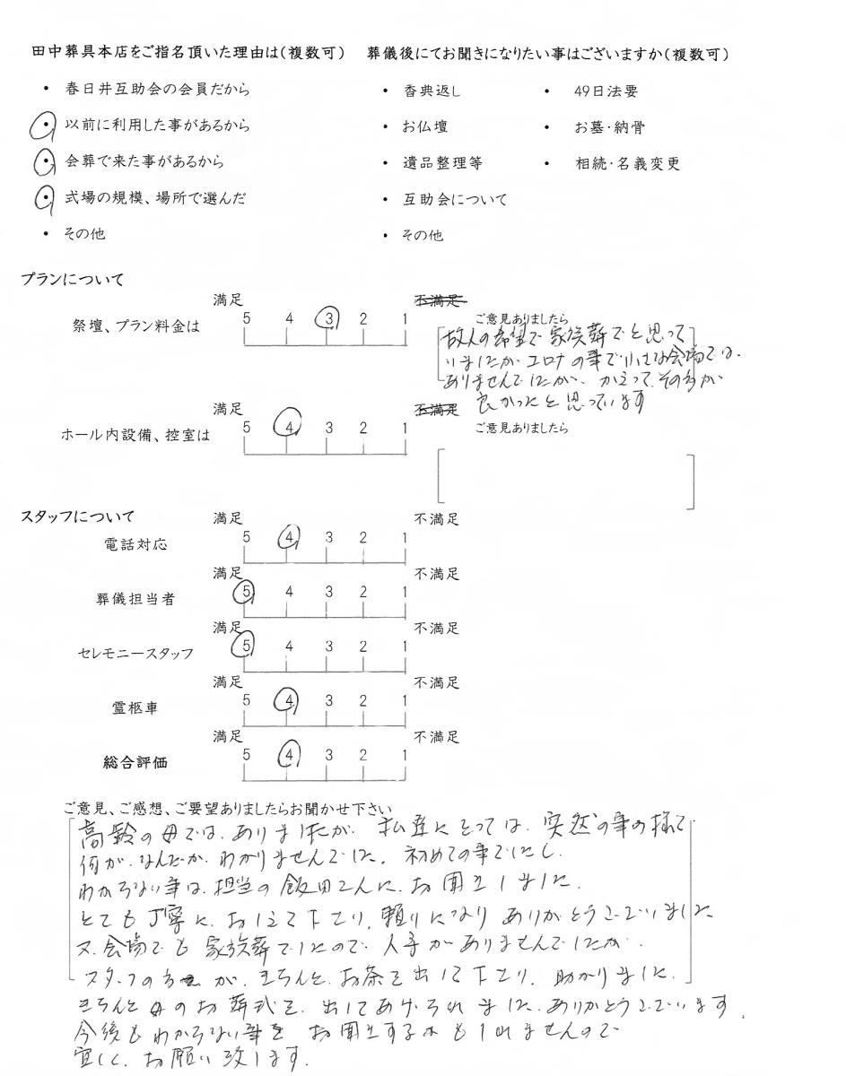 今後もいただきましたご意見を参考に、ご遺族様に寄り添ったお葬式のお手伝いをさせて頂きたいと思います。この度はありがとうございました。