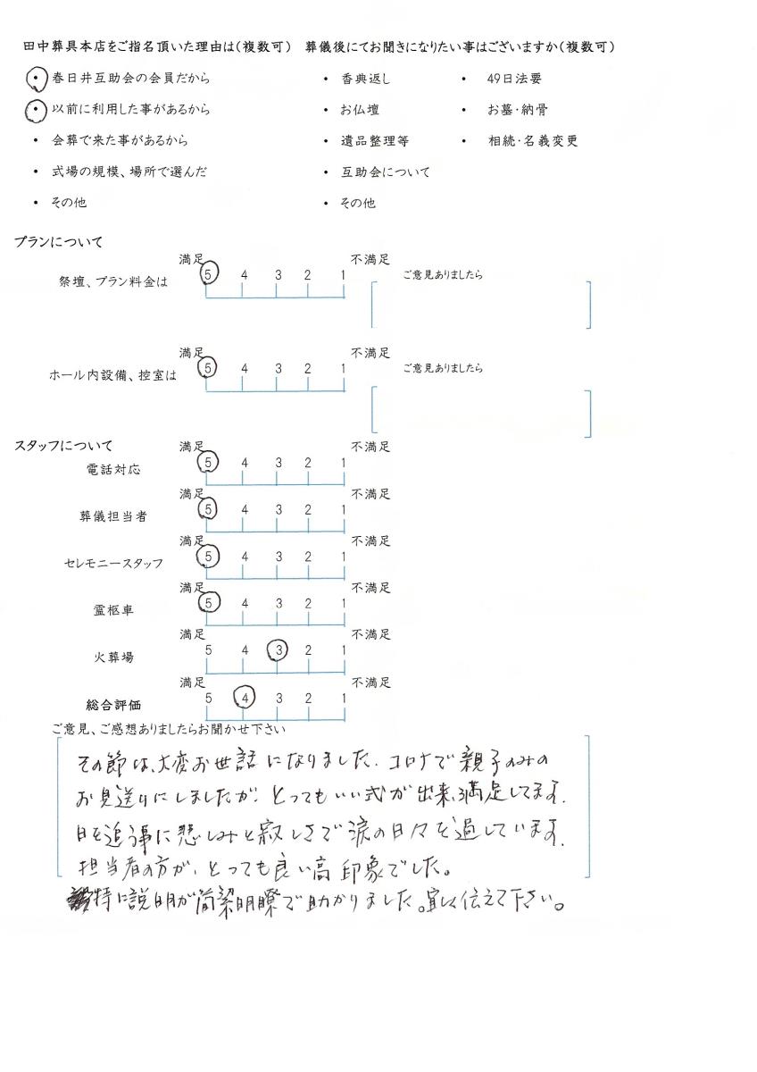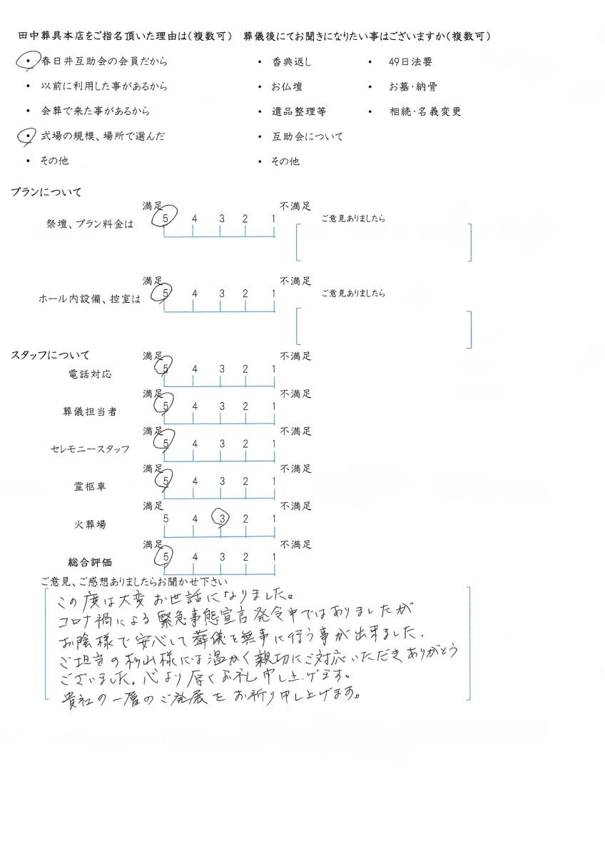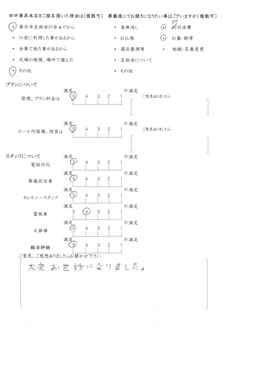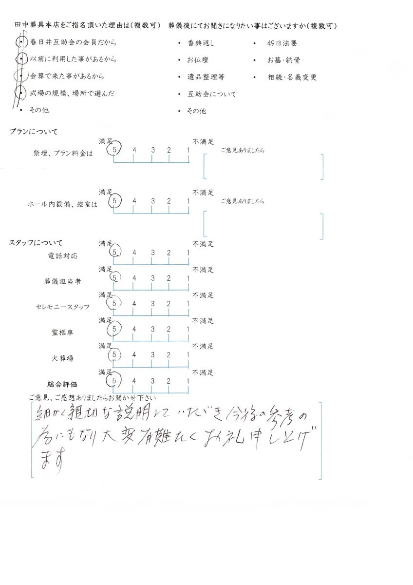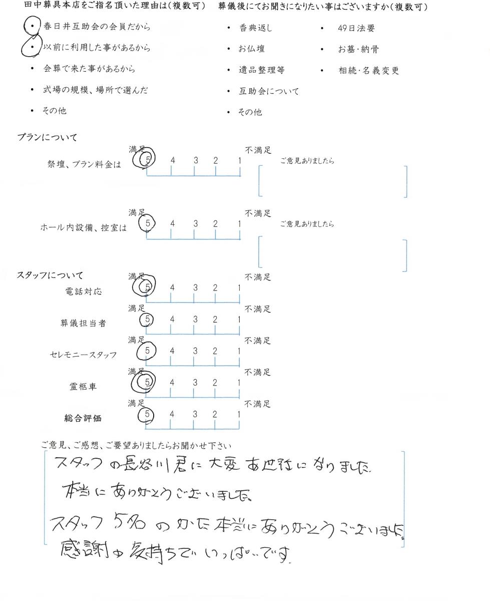 今後もいただきましたご意見を参考に、ご遺族様に寄り添ったお葬式のお手伝いをさせて頂きたいと思います。この度はありがとうございました。