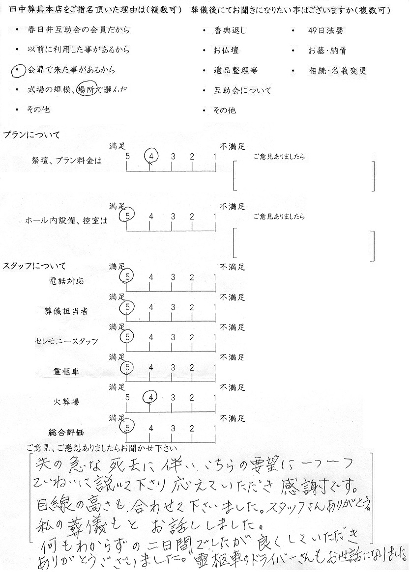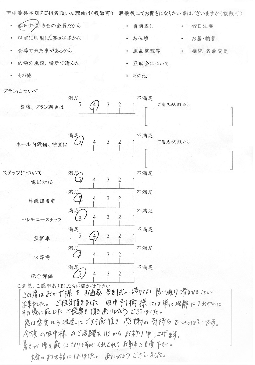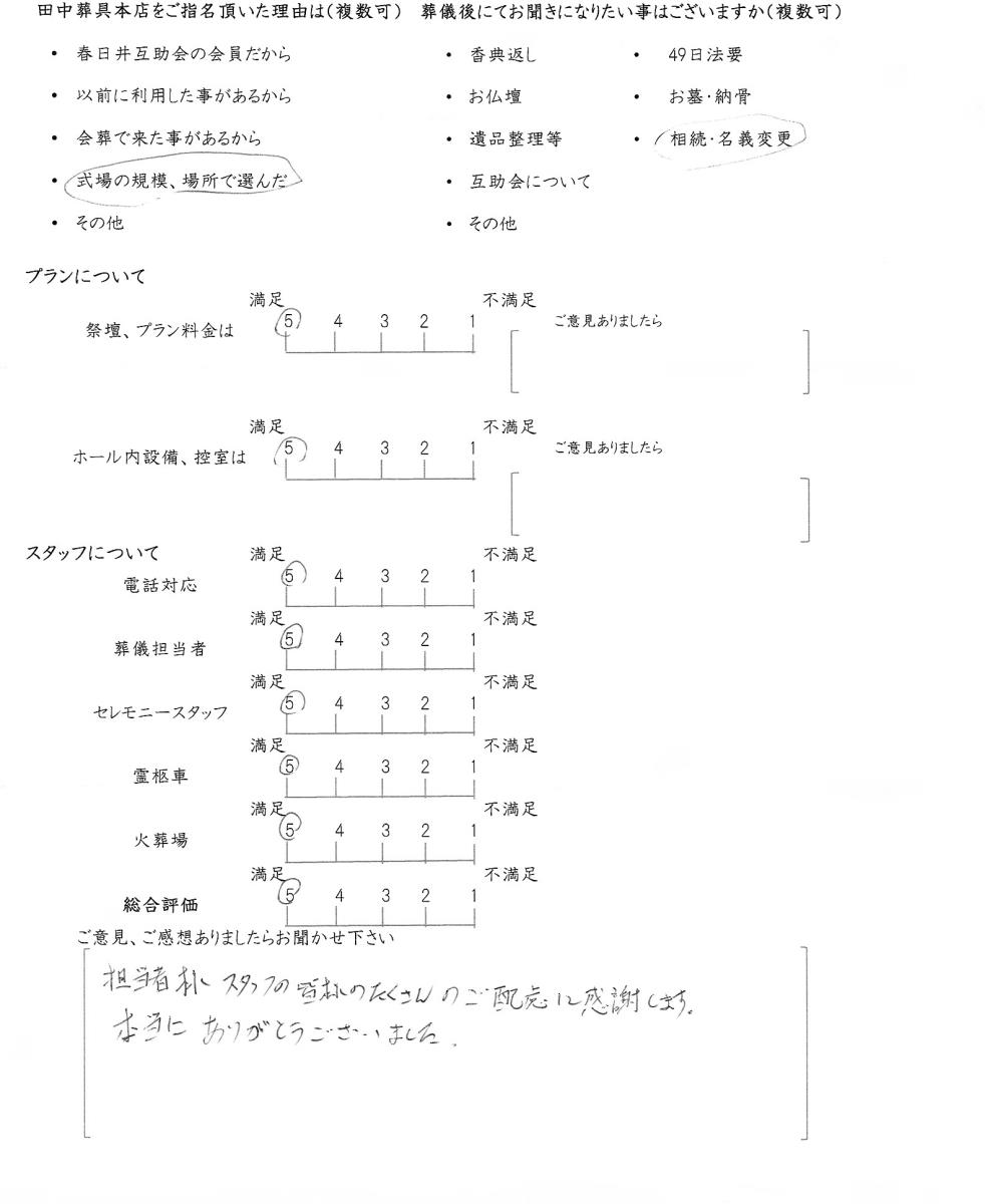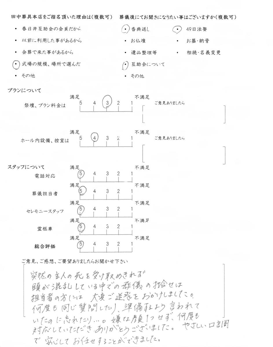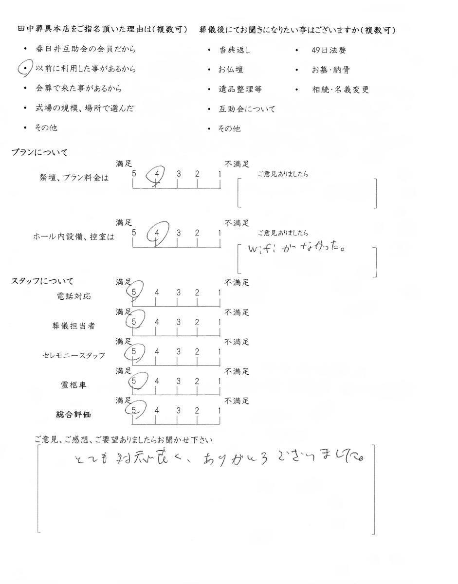 今後もいただきましたご意見を参考に、ご遺族様に寄り添ったお葬式のお手伝いをさせて頂きたいと思います。この度はありがとうございました。