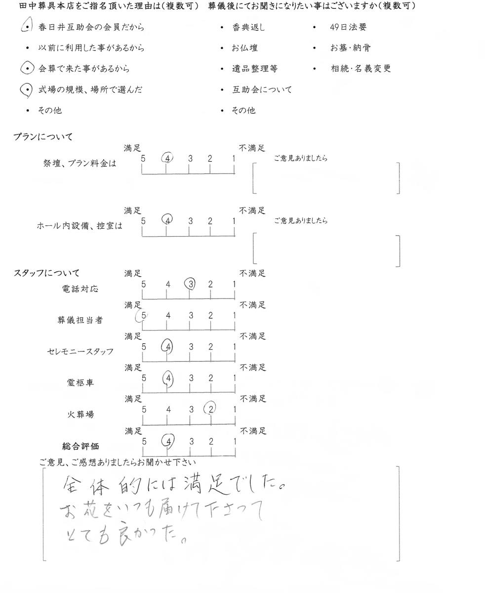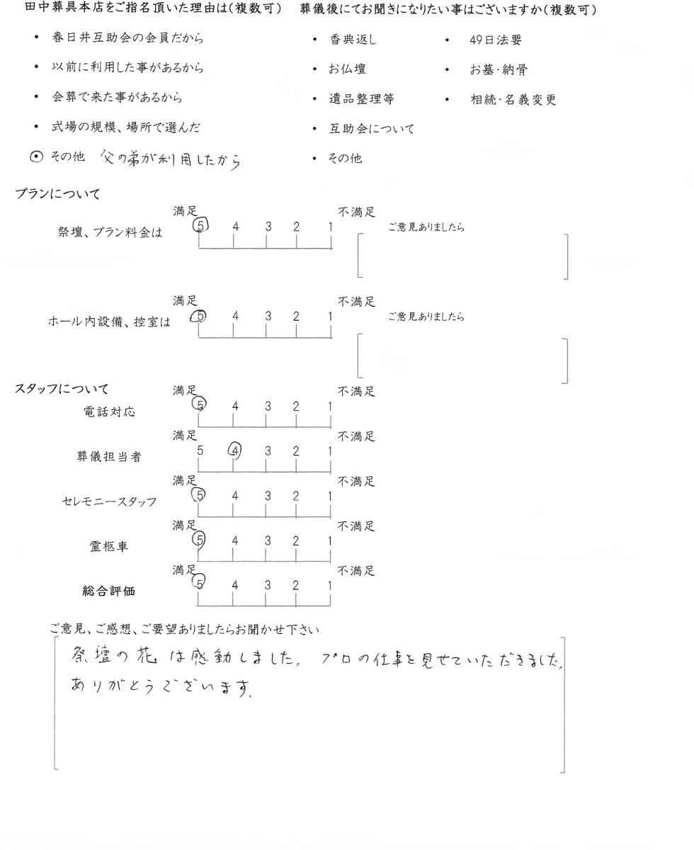 この度はアンケートにご回答いただきまして誠にありがとうございます。お花届のサービスは、弊社の先代社長が「どうしたらお客様が喜んでくださるのか」「どうしたら葬儀後も地域のお客様によりそう事ができるのか」と故人様を偲び、毎週供養のためのお花を忌明け法要までお届けさせていただいているサービスでございます。お喜びいただきまして幸いです。